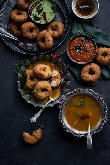 Medu Vada is made from a batter of urad dal which is soaked, ground to a smooth paste, and then shaped into round discs with a hole in the center.