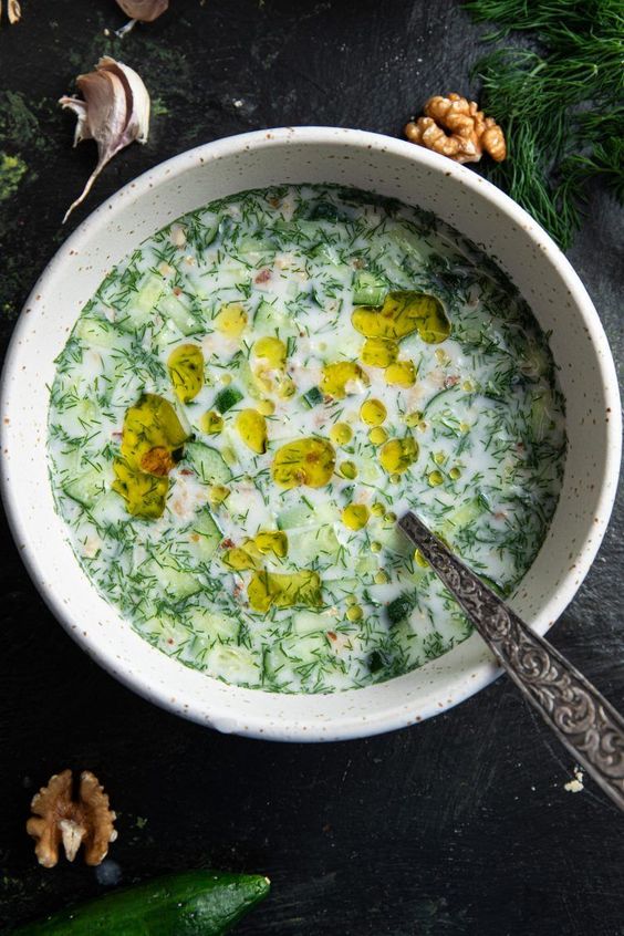 | Tarator | Bulgaria | Thin, drinkable | Yogurt, cucumber, garlic, walnuts, dill | Chilled |