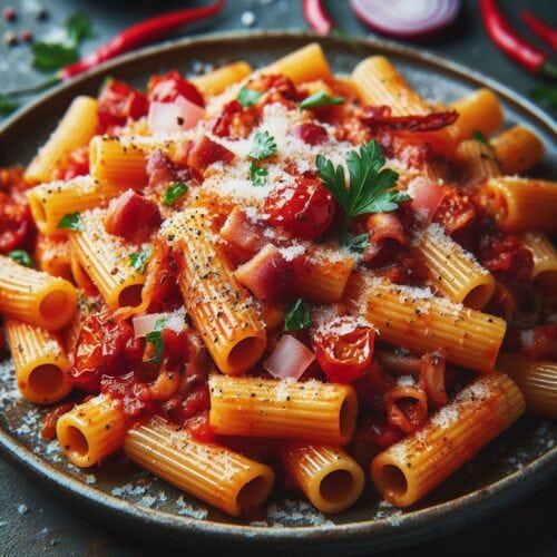 I still remember the first time I tasted Rigatoni all’Amatriciana in Italy. I was sitting in a tiny Roman trattoria, sunlight hitting my table like a spotlight, and the waiter brought me a bowl of rigatoni swimming in this deep red, glossy sauce. One bite and boom, I understood why the Italians guard this recipe like a national treasure. The guanciale crisped just right, the tomatoes tasted like they came from the sun itself, and the Pecorino Romano had the attitude of an Italian nonna.