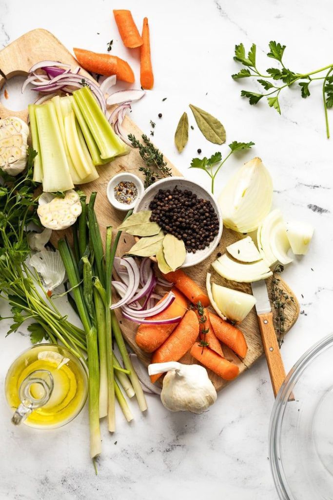 - Bones: The star player! From chicken to veal to fish, bones provide flavor and gelatin (which gives the stock its body).