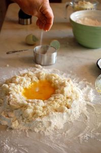 Add the refined flour, egg yolk and salt and mix thorough. Let it rest for 5 - 10 minutes.